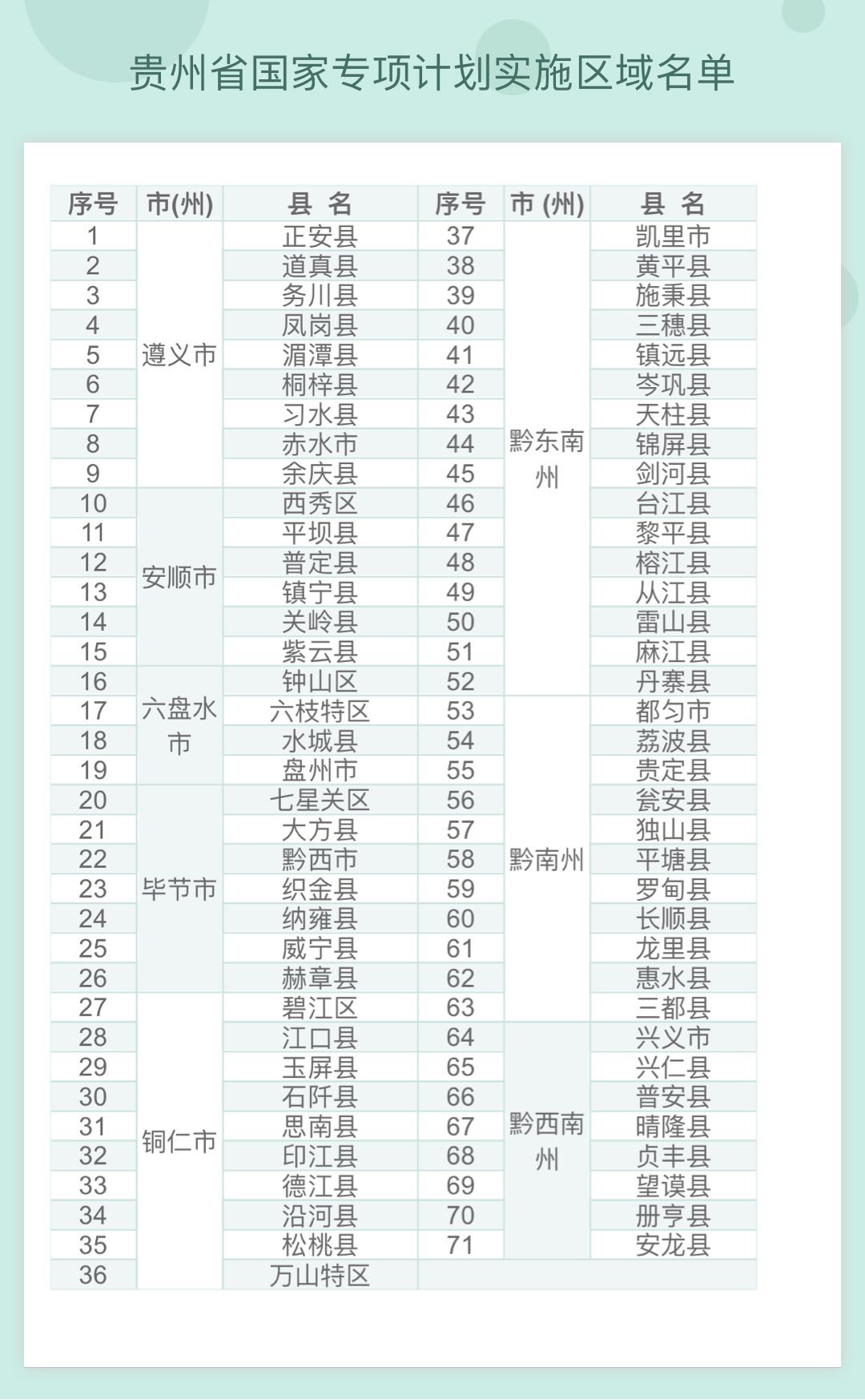 中央部门所属高校、各省(市、区)所属重点高校及我省贵州大学将面向全省71个县(市、区、特区)实施国家专项计划,招生计划由教育部统一下达,并在贵州省2021年高考高校招生专业目录上公布。