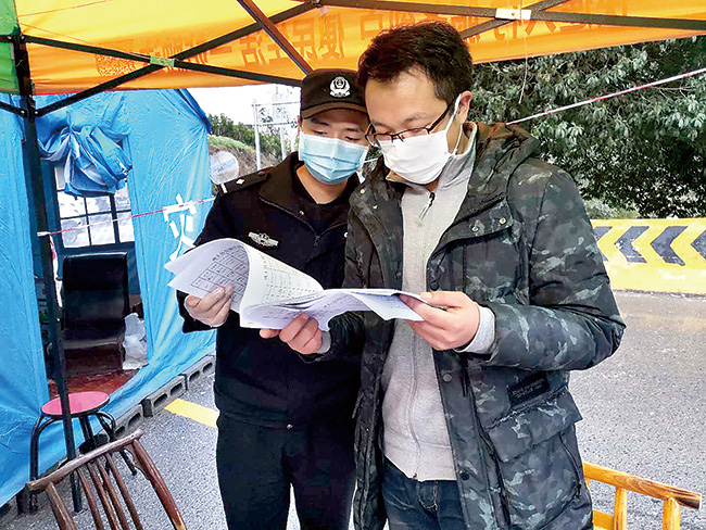图为疫情期间,谢睿(右)在咸丰县清坪镇把界村大河边交通卡点查看车辆出入登记台账。(湖北省咸丰县纪委监委供图)