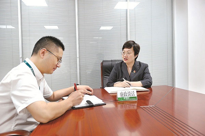 刘琤(右)定期对纪检干部开展谈话,对工作中可能产生的廉政风险进行提醒。郑晓青 摄
