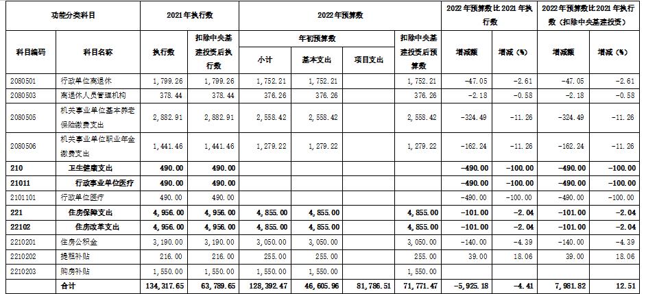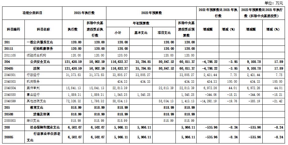 最高人民法院2022年一般公共预算支出128,392.47万元,比2021年执行数减少5,925.18万元、下降4.41%;2022年扣除中央基建投资项目后预算为71,771.47万元,比2021年扣除中央基建投资项目后执行数增加7,981.82万元、增长12.51%。2022年,按照党中央、国务院关于过紧日子的有关要求,厉行节约办一切事业,大力压减一般性支出,重点压减了公用经费和其他法院支出等项目支出中涉及的非急需非刚性支出,同时合理保障了案件审判等支出需求,体现在有关支出科目中。具体安排情况如下: