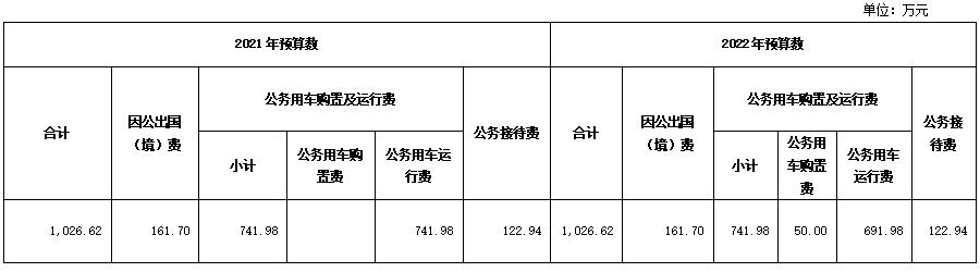 为贯彻落实中央八项规定精神,坚持勤俭节约,反对铺张浪费,最高人民法院积极采取有效措施,切实提高“三公”经费预算约束力,严格控制2022年“三公”经费预算规模。2022年财政拨款安排“三公”经费预算1,026.62万元,与2021年持平。其中:因公出国(境)费161.70万元;公务用车购置及运行费741.98万元,包括公务用车购置费50.00万元,公务用车运行费691.98万元;公务接待费122.94万元。