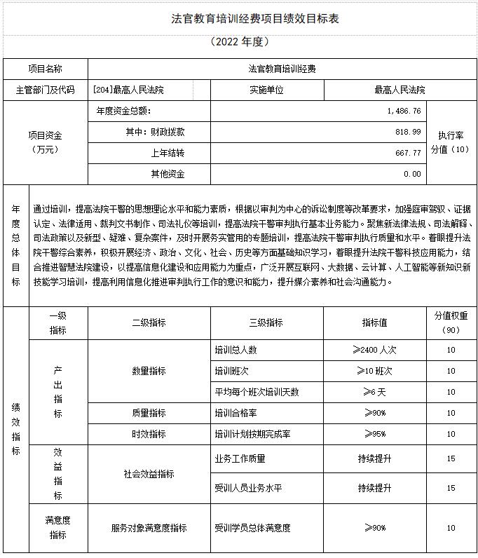 2022年最高人民法院项目支出绩效自评实现全覆盖,涉及一般公共预算拨款81,786.51万元。根据以前年度绩效评价结果,优化法院审判业务、法院保障业务等项目支出2022年预算安排,并进一步改进管理、完善政策。