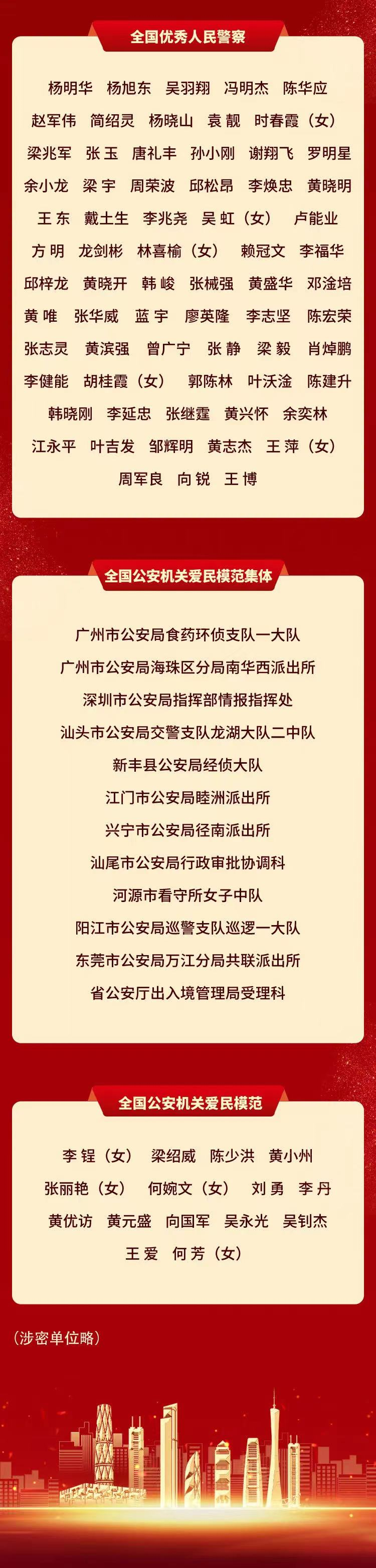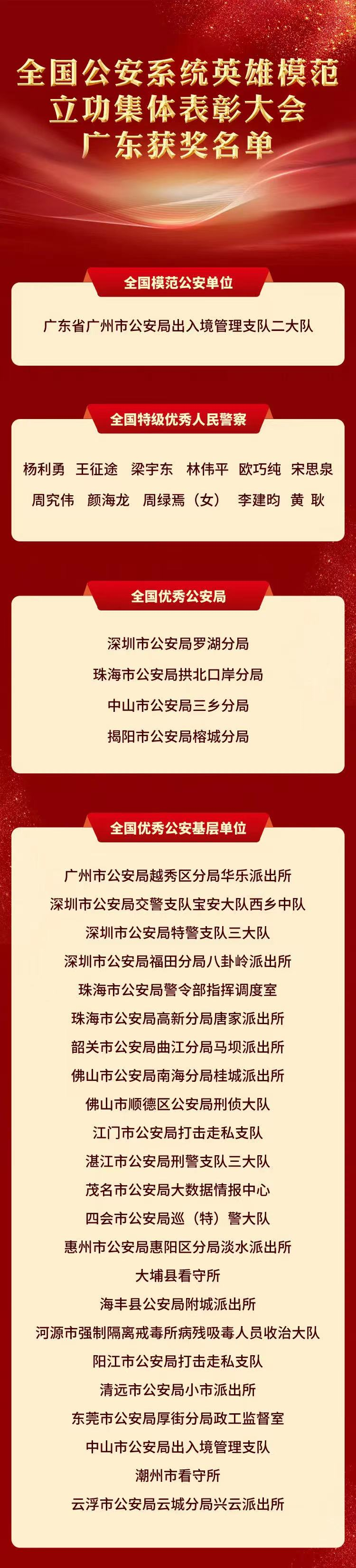 广东公安共有46个集体、94名个人在大会上受到表彰。其中,广州市公安局出入境管理支队二大队被党中央、国务院授予全国模范公安单位;汕尾市公安局警察训练支队一级警长颜海龙等11名同志被人社部、公安部联合授予全国特级优秀人民警察;深圳市公安局罗湖分局等4个集体被评为全国优秀公安局;珠海市公安局高新分局唐家派出所等28个集体被评为全国优秀公安基层单位;新兴县公安局刑侦大队警务技术四级主管王萍等68名同志被评为全国优秀人民警察;江门市公安局睦洲派出所等13个集体被评为全国公安机关爱民模范集体;佛山市公安局高明分局荷城派出所二级警长何婉文等15名同志被评为全国公安机关爱民模范。