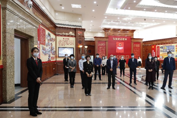 参观活动在我院的党建大厅开始,回望百年党史,学习伟大理论,坚定前进方向,凝聚磅礴力量,中国共产党的精神使人振奋。接着,大家在领袖故事长廊放慢脚步,认真领会习总书记工作和生活中的故事,学习总书记,紧跟总书记。随后一行人参观了科技法庭、法官监督墙、图书馆等场所。