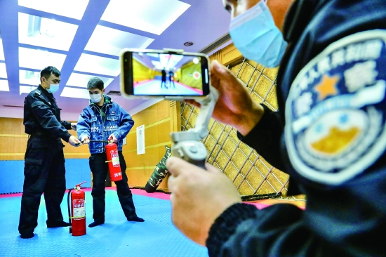 3月28日是第27个“全国中小学生安全教育日”,天津市特警总队三支队联合新华中学和苑学校组织开展校园安全教育“云课堂”。特警队员录制了视频课程,向学生们介绍相关知识,进一步增强了他们的安全防范意识。图为录制现场。