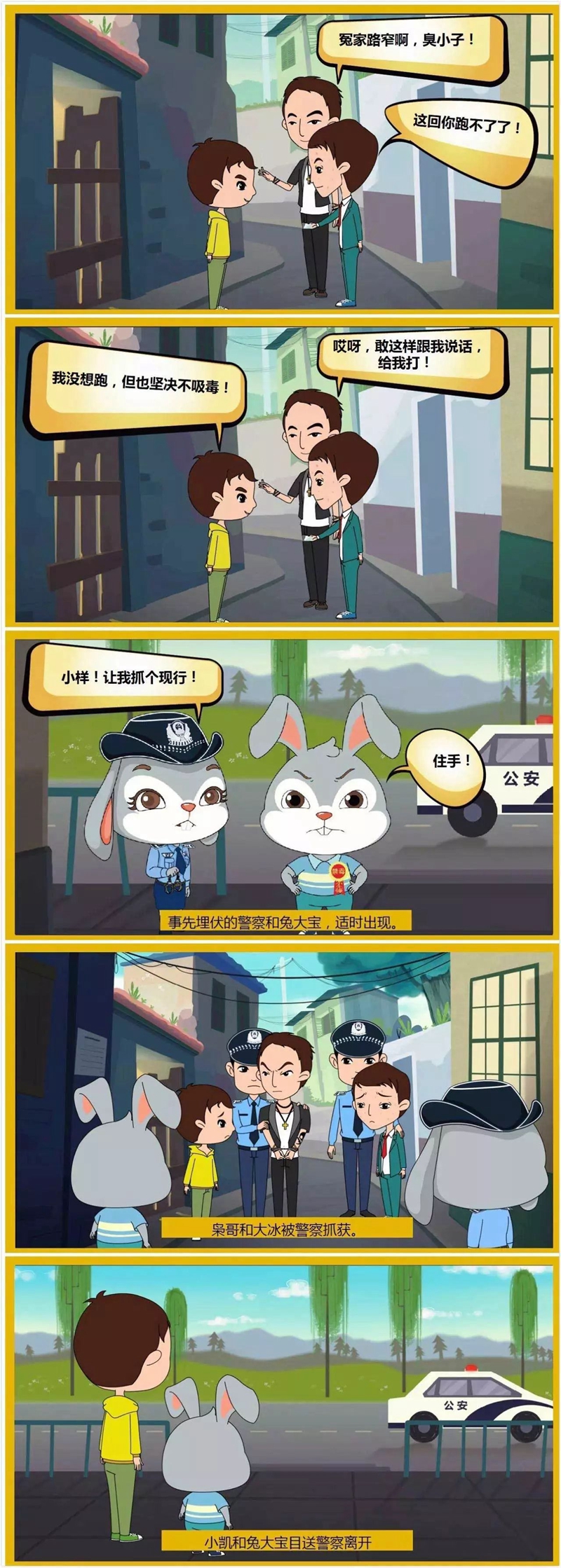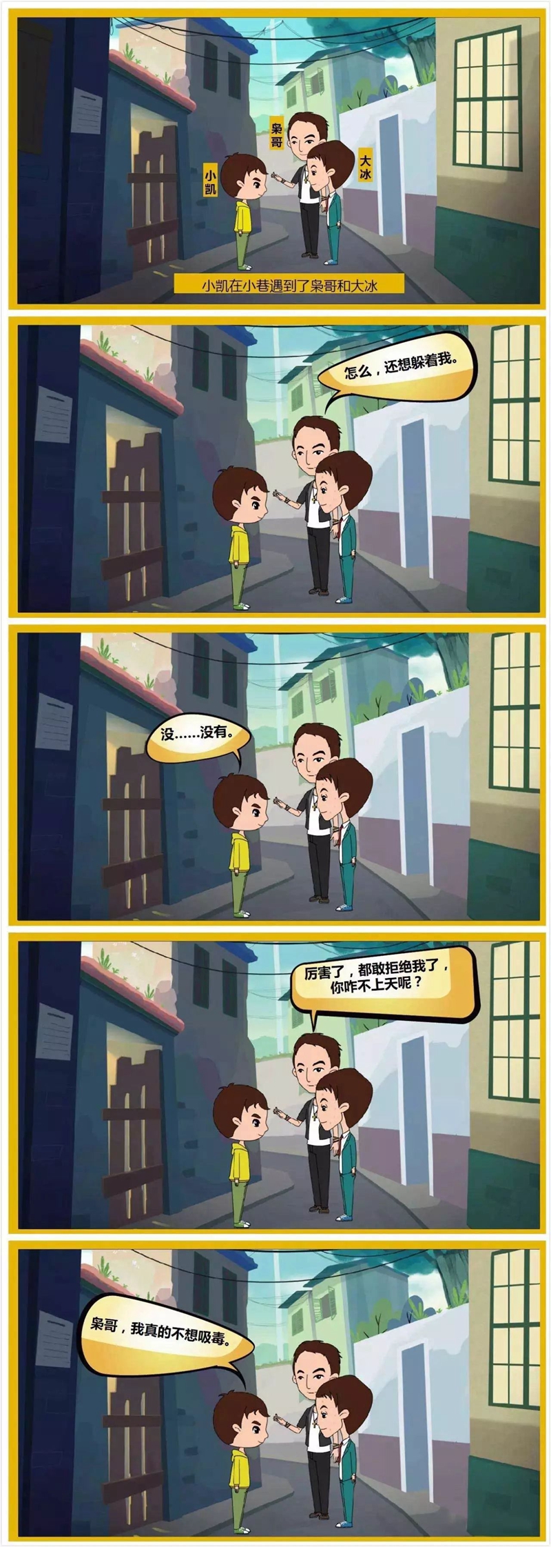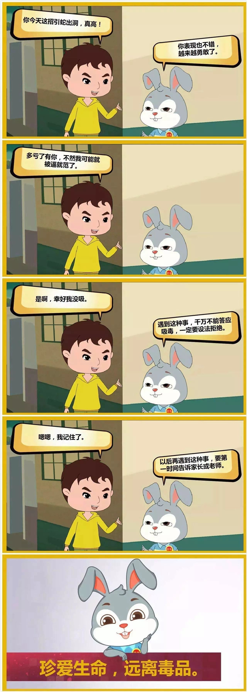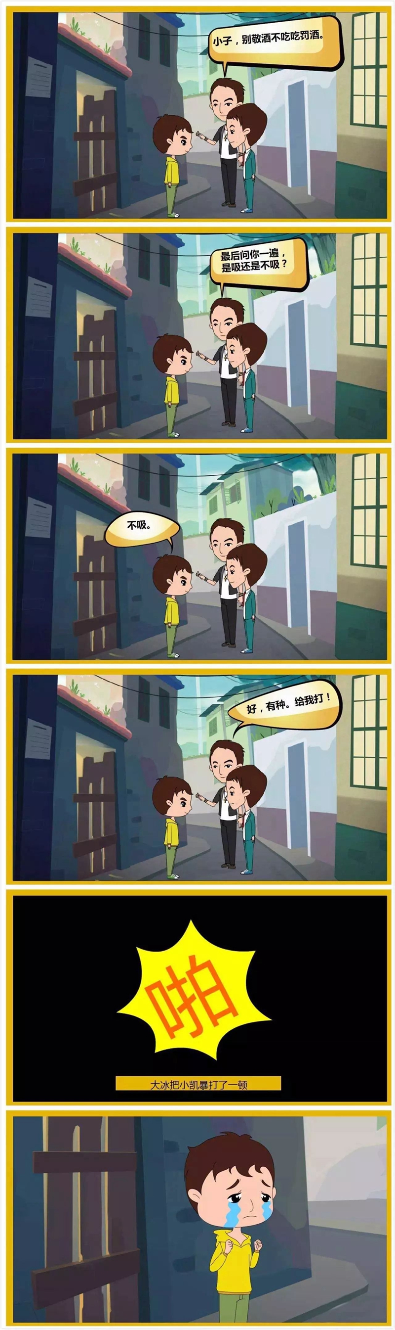 下面这个漫画故事告诉青少年:遇到他人胁迫自己吸毒时,绝不能被逼就范沾染毒品,要设法逃脱,并及时告知家长、老师或警察,请求帮助,还要从此远离染毒的朋友。