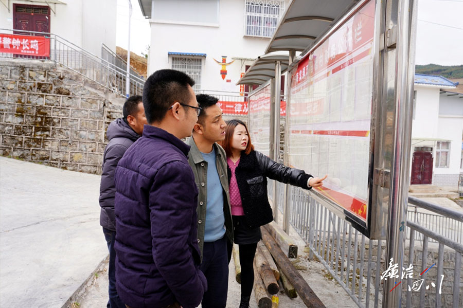 甘洛县乡镇交叉检查组在海棠镇双马槽村查看公示公开情况。(吉乃衣布子 摄)