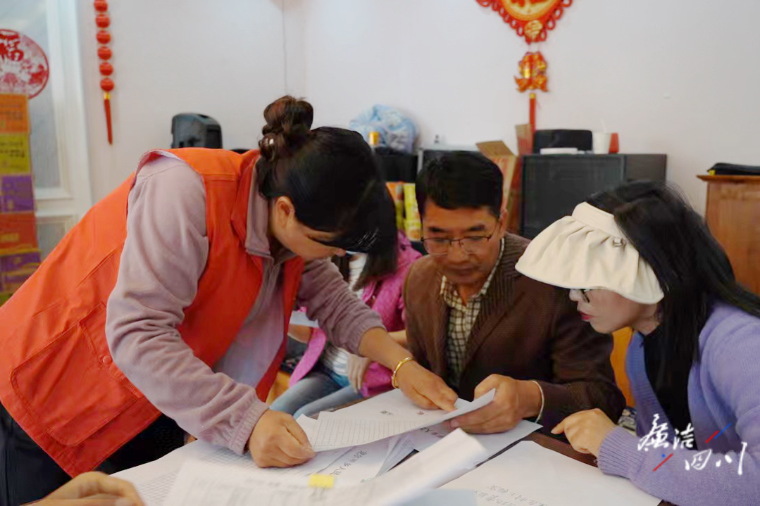马尔康市纪委室组地联合监督组在龙尔甲乡查看应急保障物资发放情况。(秦玉超 摄)