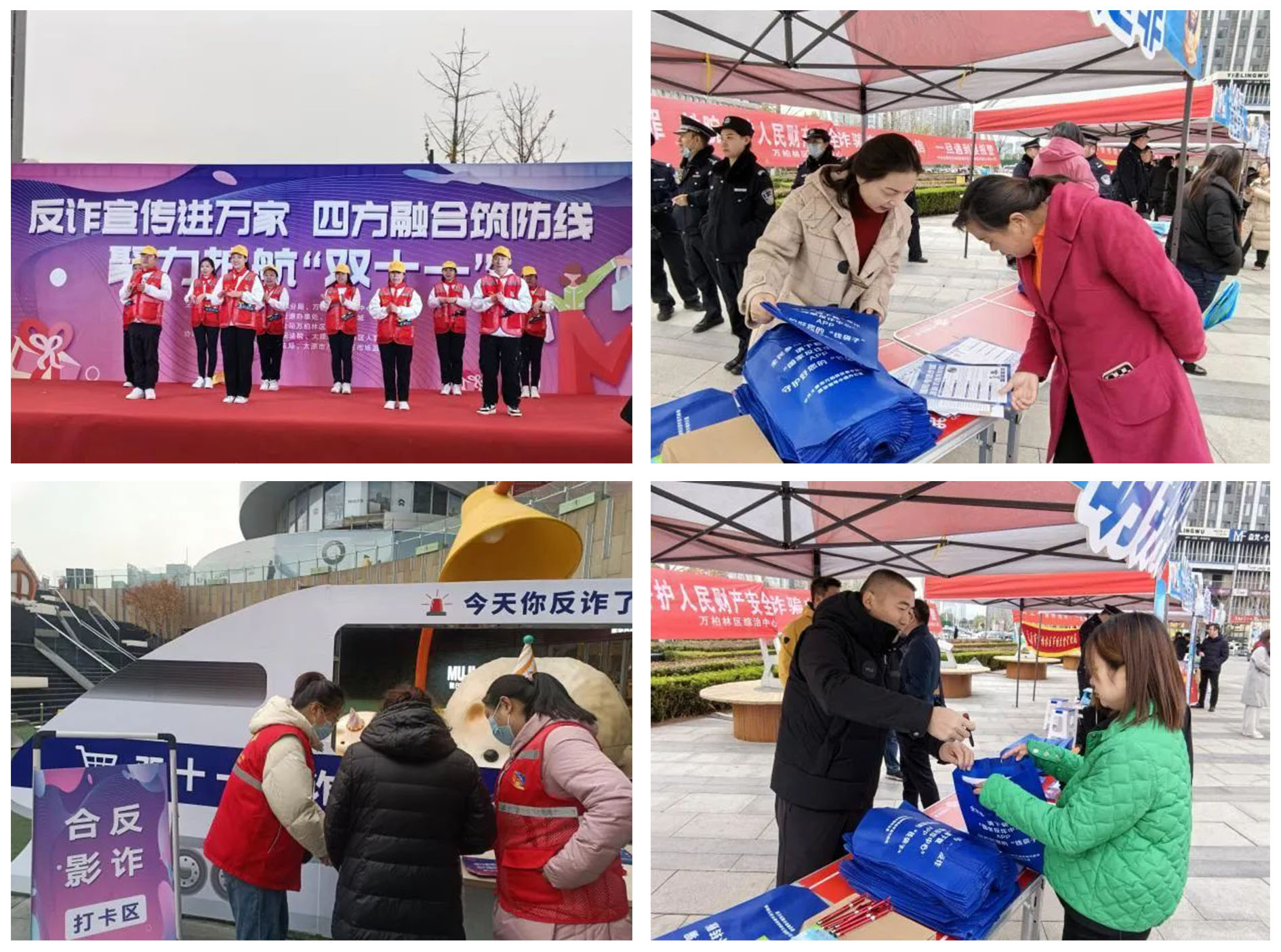 为进一步夯实“四方融合”工作基础,切实保护消费者的合法权益,营造安全良好的网购电商环境,11月10日,在“双十一”来临之际,由太原市公安局万柏林分局、万柏林区综治中心、长风西街街道、太原万象城、中国联通万柏林分公司主办,区法院、区检察院、区司法局、区市场监督管理局协办,在万象城共同开展“反诈宣传进万家 四方融合筑防线 聚力护航‘双十一’”系列宣传活动。