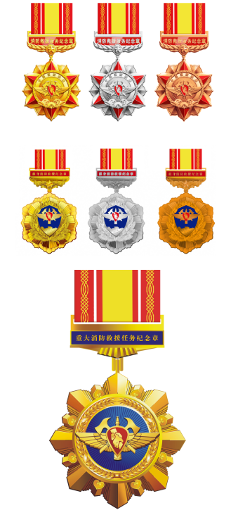 其中,金质、银质、铜质“消防救援服务纪念章”分别颁发给从事消防救援工作满30年、16年、8年的消防救援人员;金质、银质、铜质“献身消防救援纪念章”分别颁发给烈士和因公牺牲、因公致残的消防救援人员;“重大消防救援任务纪念章”颁发给执行有关重大灭火救援、抢险救灾和消防安全保卫等任务的消防救援人员。