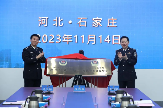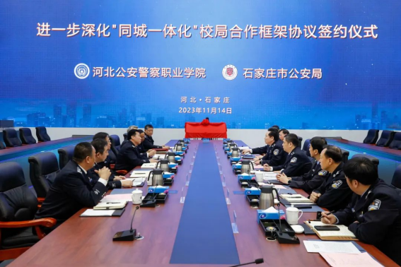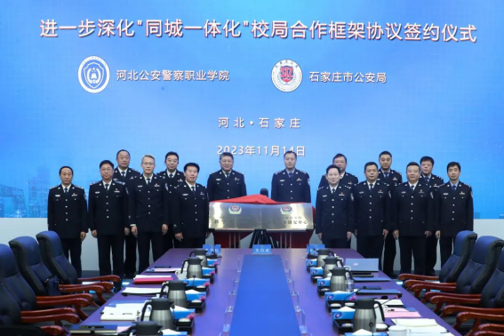 11月14日上午,石家庄市公安局与河北公安警察职业学院在市公安局举行了进一步深化“同城一体化”校局合作框架协议签约暨“河北公安警察职业学院教学实践基地”“石家庄市公安局现代警务研究中心”揭牌仪式。省公安厅副厅长、副市长、公安局长梁昆,省警院党委书记乔敬图出席活动,双方签署了《“同城一体化”校局合作框架协议》,并为“河北公安警察职业学院教学实践基地”“石家庄市公安局现代警务研究中心”揭牌。
