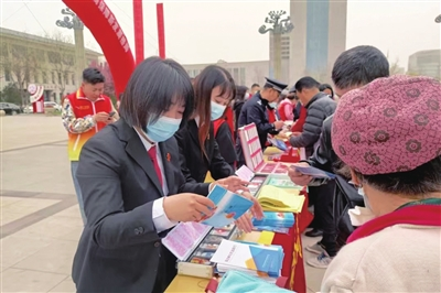 小店区人民法院干警走上街头向群众发放宣传手册并进行普法宣讲。