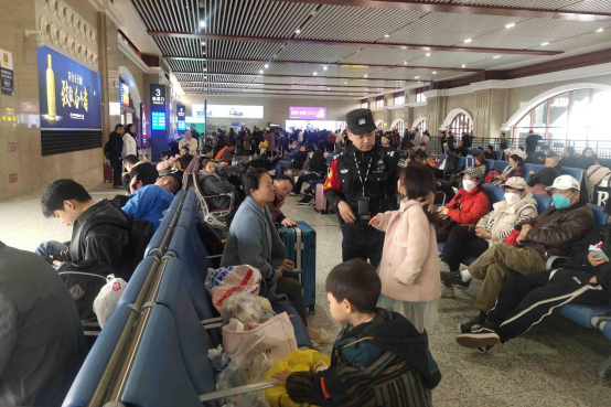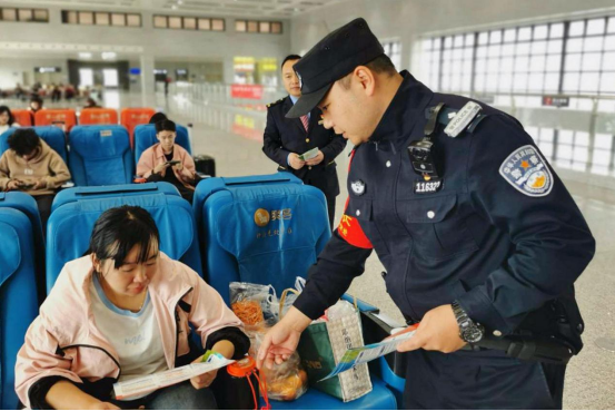 图丨民警对候车旅客开展防寒反诈反扒等出行安全知识宣传教育(供图:贵铁公宣)