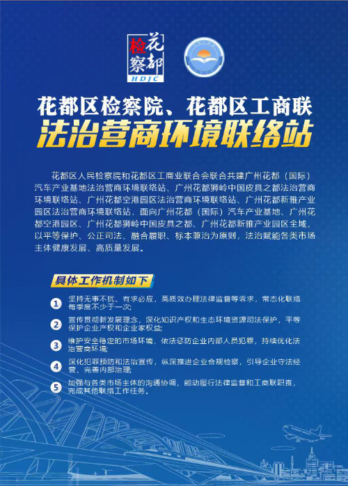 广州市花都区人民检察院能动发挥法治固根本、稳预期、利长远的保障作用,落实最高人民检察院“检察护企”专项行动,立足检察职能、突出区域特色,以法治营商环境联络站为切入点,打造企业“家门口”检察服务平台,以法治营商环境服务矩阵为助推器,助力花都高水平打造广州北部增长极,服务保障广州“第二次创业”。