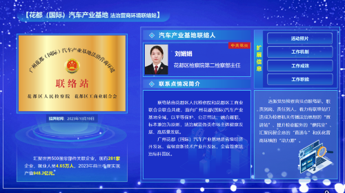 花都区人民检察院推进共建以检察便民联络站为载体的“红棉花检e站”28个,覆盖花都四街六镇全域。其中,花都区人民检察院、区工商联在花都(国际)汽车产业基地、狮岭(国际)皮具皮革城、空港园区、新雅产业园区共建的4个法治营商环境联络站,已形成覆盖本区核心产业群的法治营商环境服务矩阵。