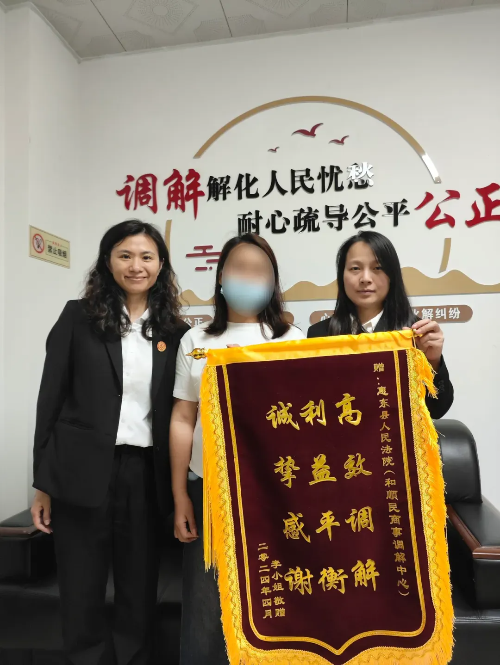 一周后,李女士将一面印有“高效调解、利益平衡、诚挚感谢”的锦旗送到惠东县法院调解中心,“半个月不到,你们把我从家暴的枷锁中解救出来,我不知道该怎么感谢你们!”她激动地向调解员和法官分享自己的喜悦之情。