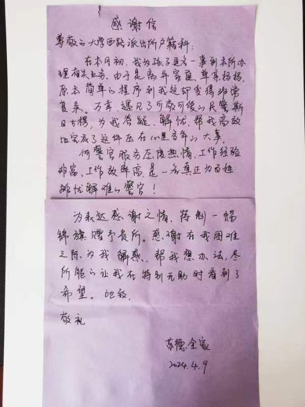 2024年4月9日下午,呼和浩特市公安局赛罕区分局大学西路派出所户籍民警何斯日古楞收到一封感谢信和一面锦旗,这不是第一次收到辖区群众的感谢信和锦旗了。因为他们在日常工作中,特别是在办理户籍业务时,户籍民辅警表现出了高度的责任心、专业素养和热情服务,解决了群众在户籍管理、身份证办理、户口迁移等方面遇到的实际困难或者提供了高效便捷的服务,因此得到了群众的衷心认可和赞扬。